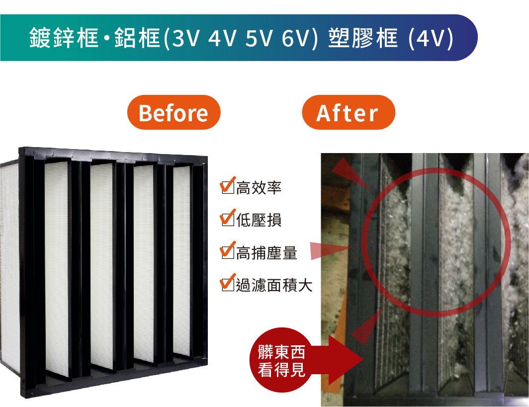 V型過濾網,因為過濾面積較大,所以能減少風阻並降低壓損;適用於大風量或需要高捕塵量之環境以節省能量消耗。
